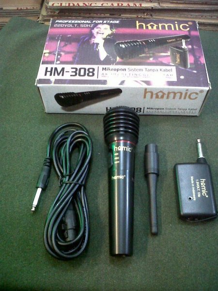 Microphone single wireless merk homic 308 2in1, bisa digunakan tanpa kabel (wireless) dan dengan kabel.